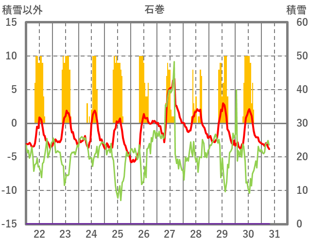 | 日 | 時 | 気温 | 降水 | 風向/風速 | 日照 | 積雪 | 降雪 |