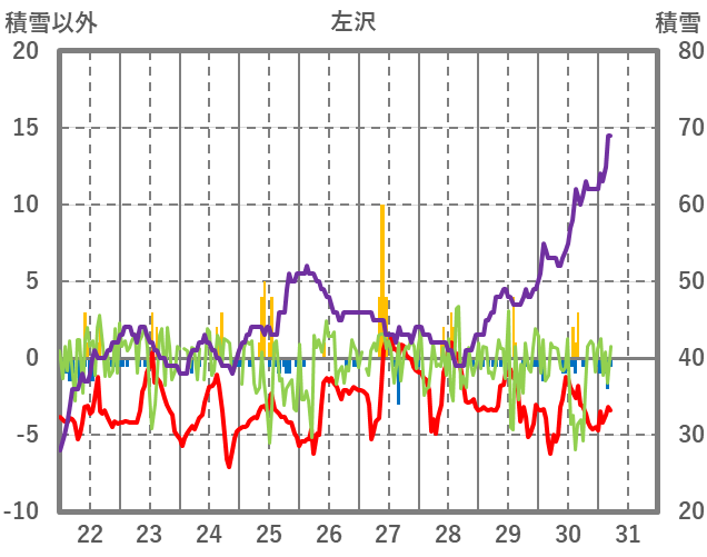 | 日 | 時 | 気温 | 降水 | 風向/風速 | 日照 | 積雪 | 降雪 |