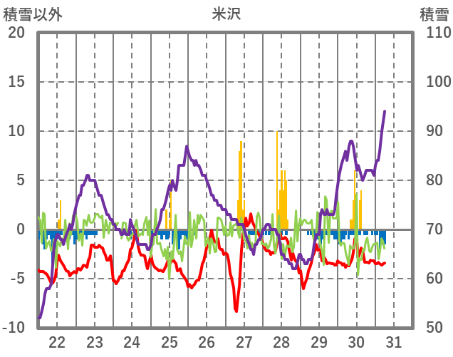 | 日 | 時 | 気温 | 降水 | 風向/風速 | 日照 | 積雪 | 降雪 |
