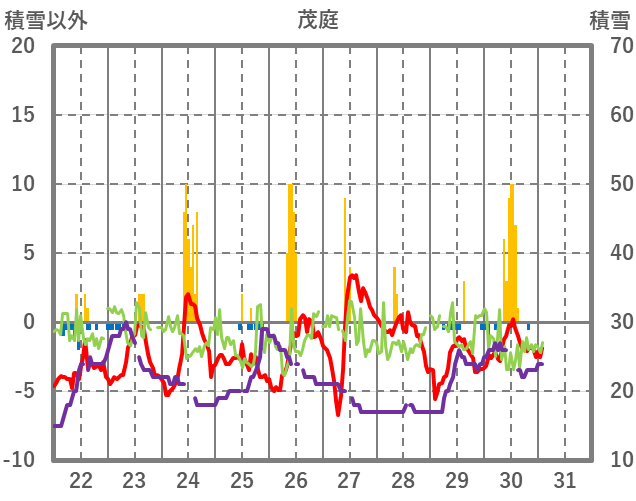 | 日 | 時 | 気温 | 降水 | 風向/風速 | 日照 | 積雪 | 降雪 |