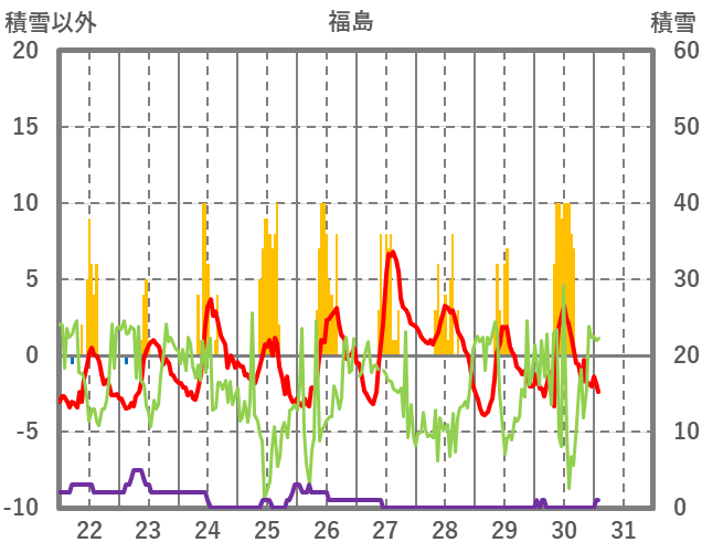 | 日 | 時 | 気温 | 降水 | 風向/風速 | 日照 | 積雪 | 降雪 |