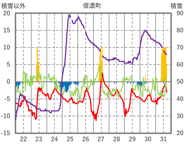 | 日 | 時 | 気温 | 降水 | 風向/風速 | 日照 | 積雪 | 降雪 |