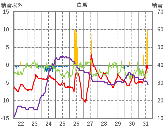 | 日 | 時 | 気温 | 降水 | 風向/風速 | 日照 | 積雪 | 降雪 |