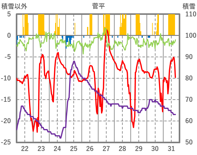 | 日 | 時 | 気温 | 降水 | 風向/風速 | 日照 | 積雪 | 降雪 |