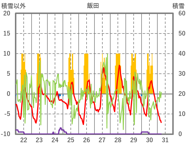 | 日 | 時 | 気温 | 降水 | 風向/風速 | 日照 | 積雪 | 降雪 |