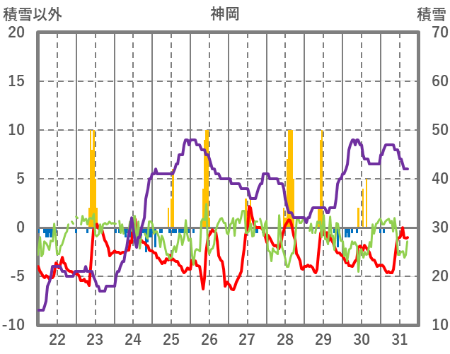 | 日 | 時 | 気温 | 降水 | 風向/風速 | 日照 | 積雪 | 降雪 |