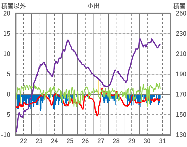 | 日 | 時 | 気温 | 降水 | 風向/風速 | 日照 | 積雪 | 降雪 |