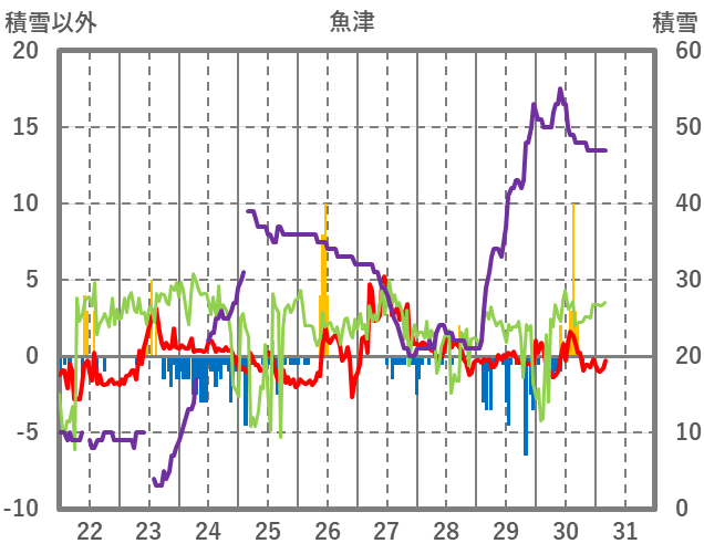 | 日 | 時 | 気温 | 降水 | 風向/風速 | 日照 | 積雪 | 降雪 |
