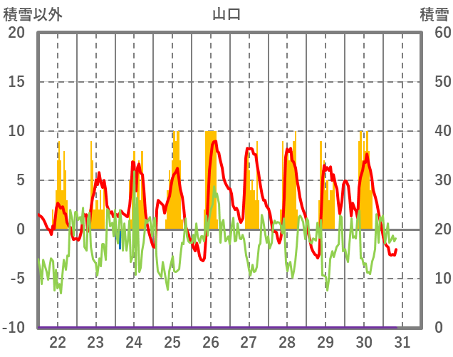 | 日 | 時 | 気温 | 降水 | 風向/風速 | 日照 | 積雪 | 降雪 |