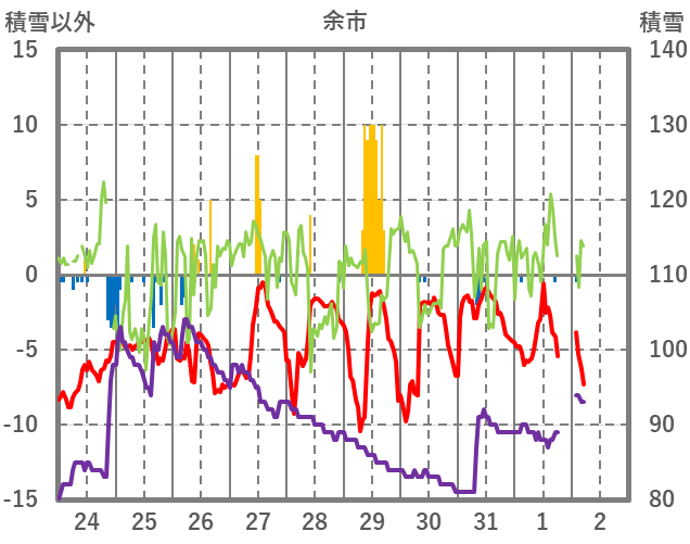 | 日 | 時 | 気温 | 降水 | 風向/風速 | 日照 | 積雪 | 降雪 |