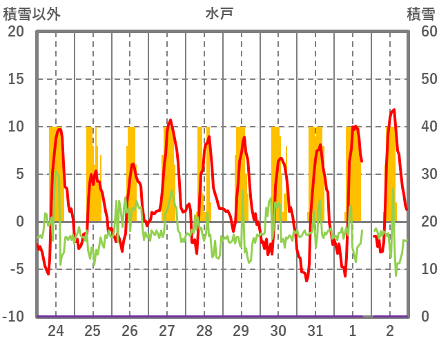 | 日 | 時 | 気温 | 降水 | 風向/風速 | 日照 | 積雪 | 降雪 |